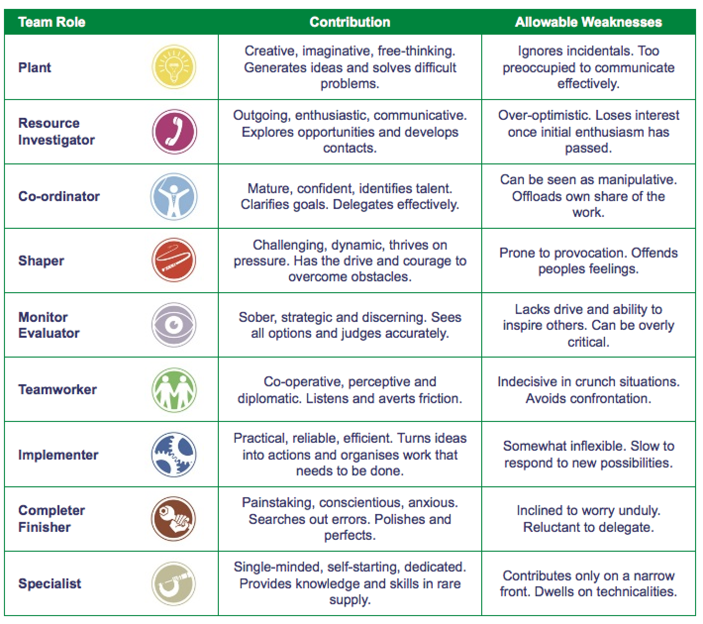 Understanding human behaviour plays a crucial role in a team success from the start to a finish of any project. Therefore, realising each member’s team role from the chart below will help you as an individual to know whom you are and how to behave when you find yourself as part of a team. Feel free to share your opinion on your preferred team role, add or argue if you agree with your listed contributions or allowable weaknesses. Thanks